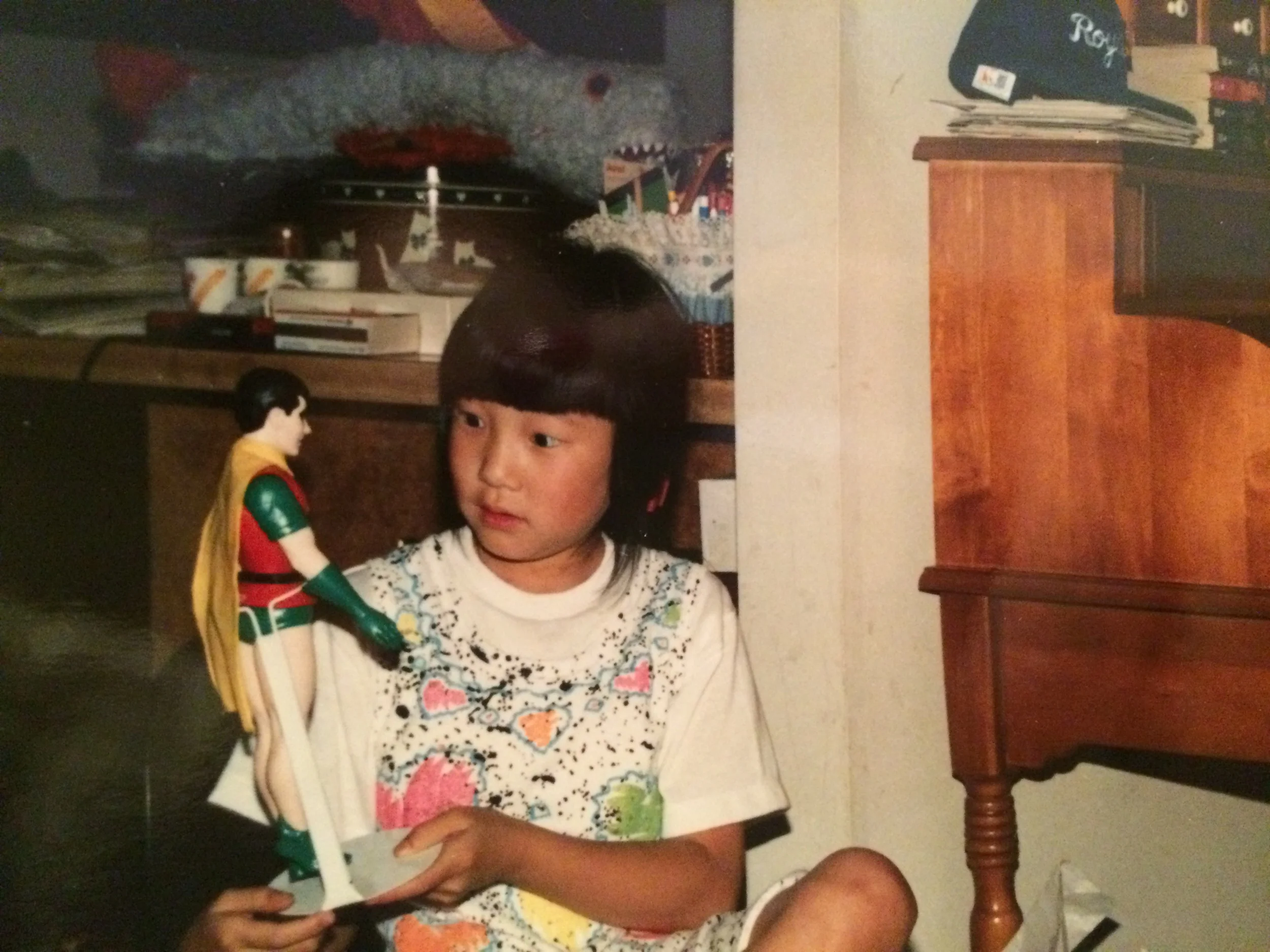 I found this photo of what looks like my 8th or 9th birthday and my Mom had gotten me a Robin figurine, which I was clearly enthralled with. I remember their slinky costumes and how they shone on the TV screen. I also loved the purple Batgirl costume that Yvonne Craig got to wear and secretly wished that I was badass enough to wear that costume.